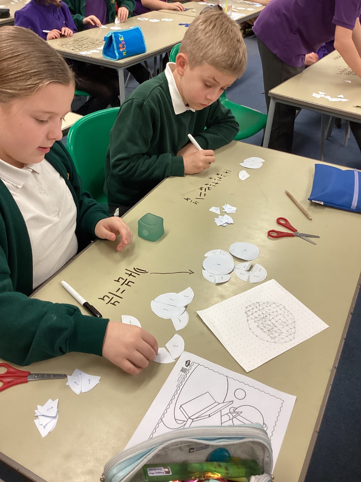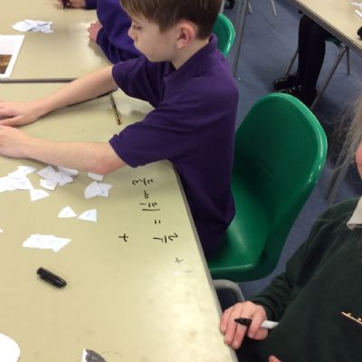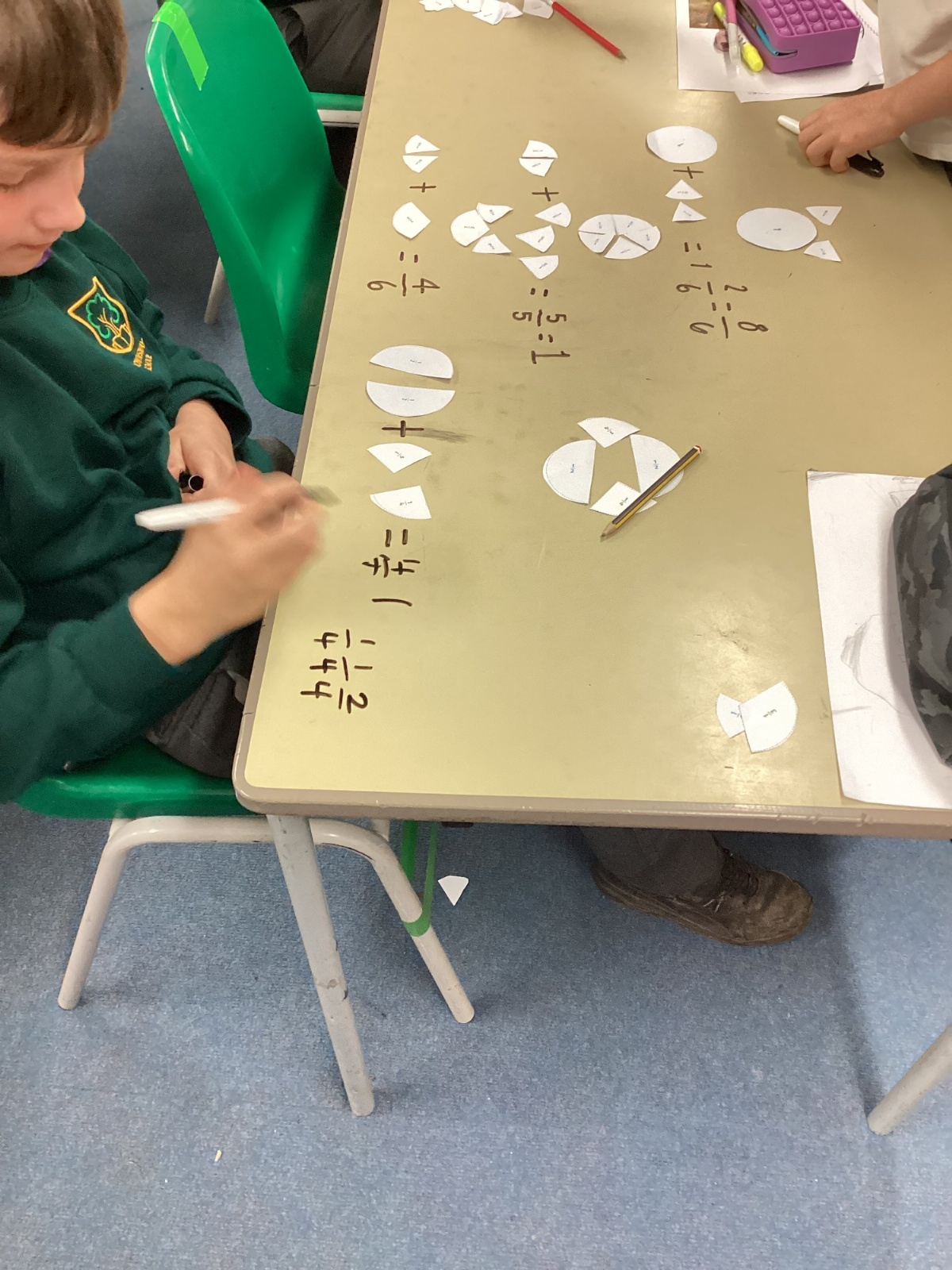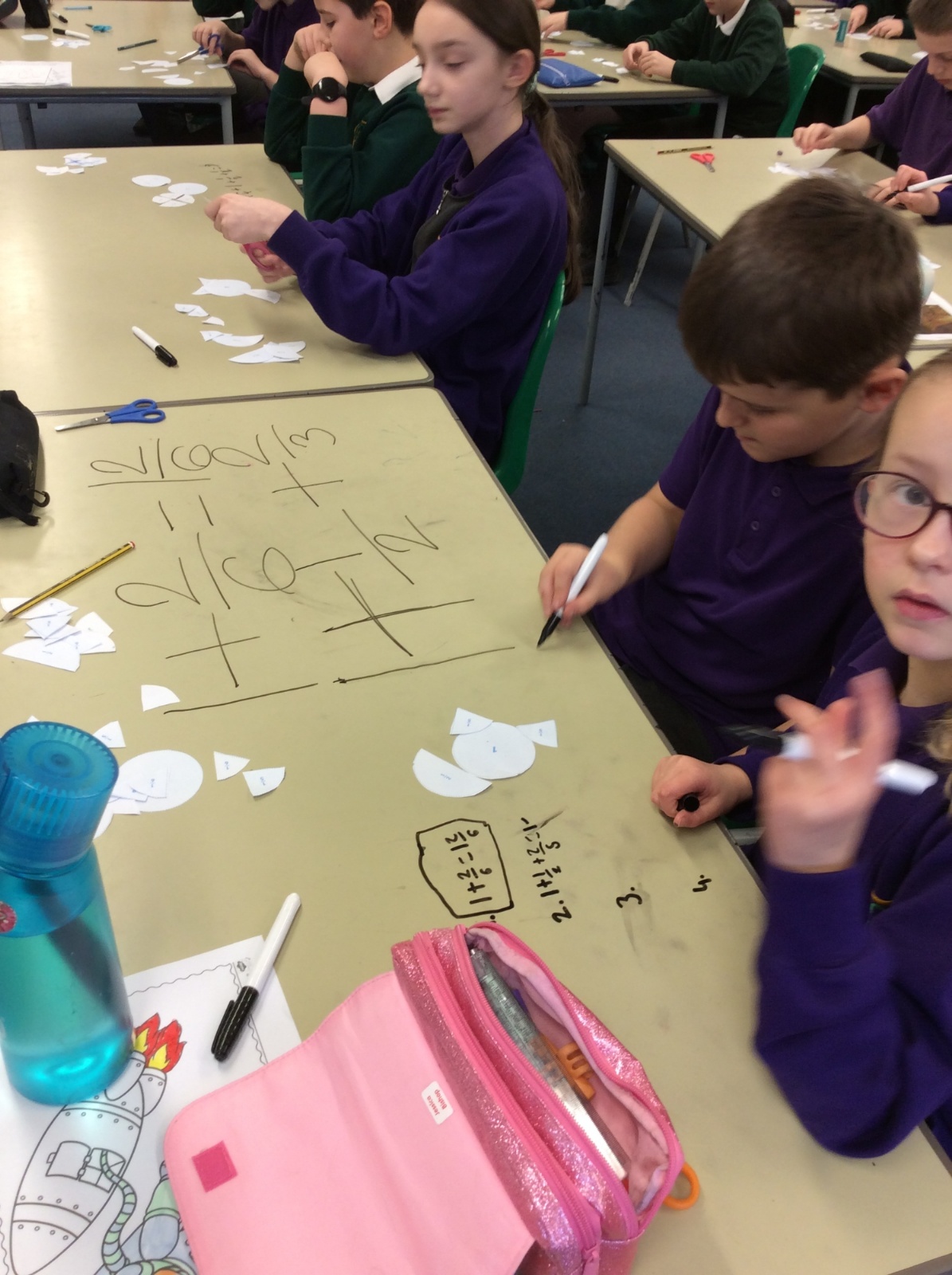 In maths this term with Miss Davis we have been working on fractions - finding equivalent fractions and adding fractions. We took part in a very practical lesson and made pictures using fractions. We then added up the fraction parts to find the total. We really enjoyed creating different shapes and the extra challenge of calculating the equivalent fractions before adding them up!